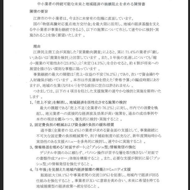 この大きな予算が動く中、私たち江津民主商工会(江津民商)は、現場の切実な声を届けるべく「中小業者の持続可能な未来と地域経済の崩壊阻止を求める陳情書」を提出いたしました。